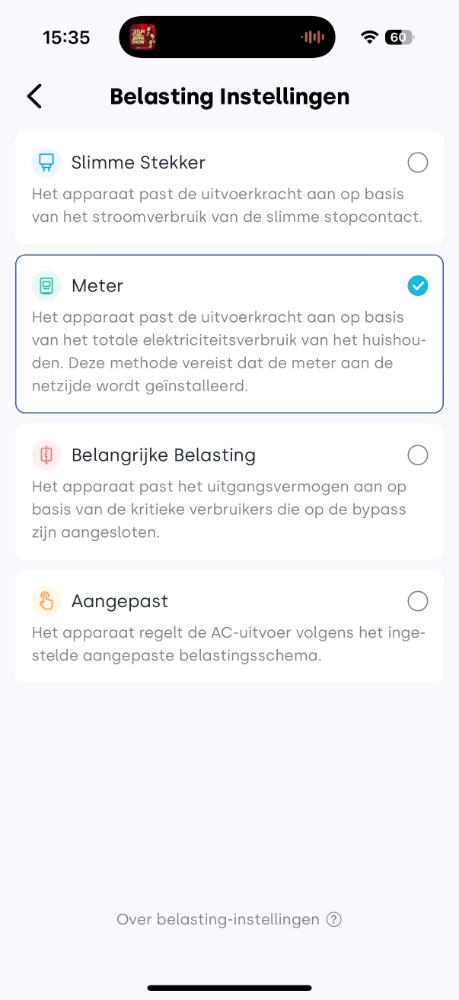 Op dit moment kan je onder instellingen > Belasting instellingen vier modi instellen voor automatisch laden & ontladen: