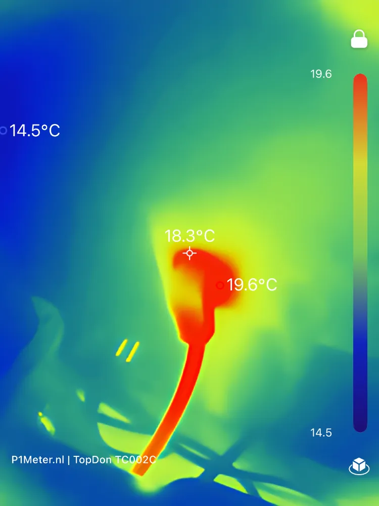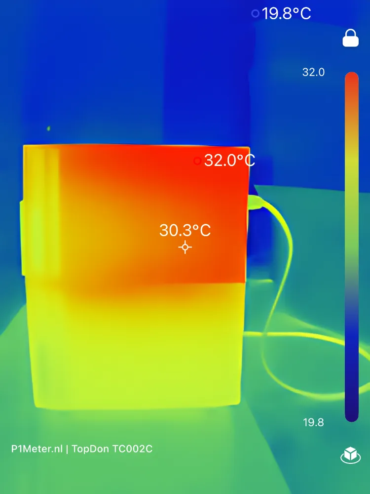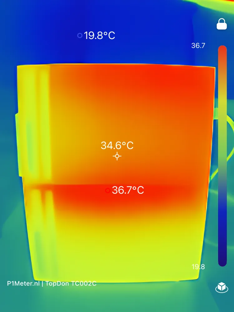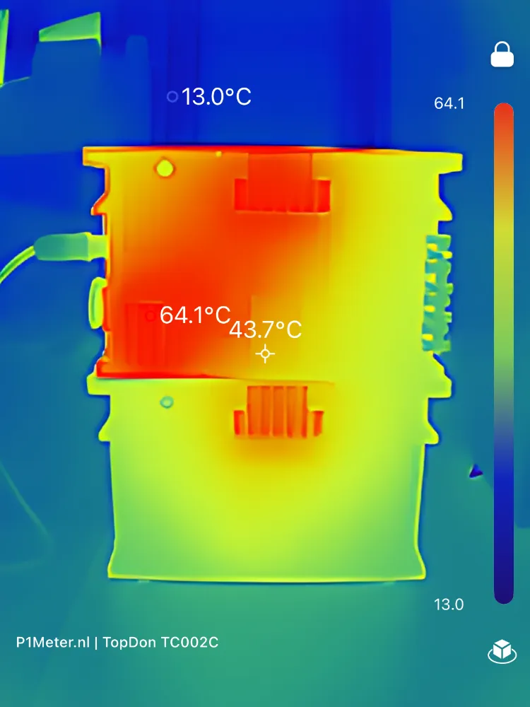 Deze metingen tonen aan dat de warmteontwikkeling exact plaatsvindt waar je het verwacht: bij het omvormergedeelte en bij de batterijmodule die het zwaarst belast wordt. Temperaturen rond de 65–70°C aan koelribben zijn normaal voor passief gekoelde stekkerbatterijen, die intern ontworpen zijn voor aanzienlijk hogere maximale temperaturen.