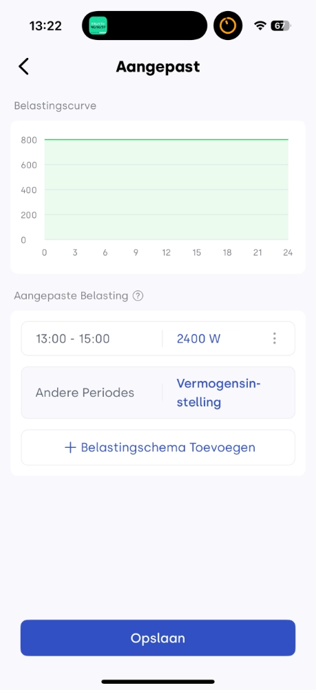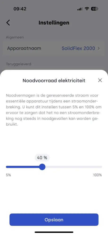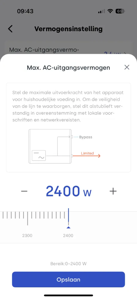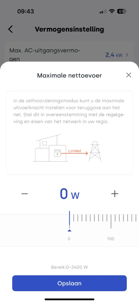 In de Indevolt-app heb je veel vrijheid om het ontlaadvermogen naar het net te verhogen, tot maximaal 2400 watt. Houd er wel rekening mee dat de Nederlandse regelgeving niet voor niets een grens van 800 watt hanteert wanneer een stekkerbatterij is aangesloten op een gedeelde groep. Wil je met meer vermogen ontladen naar het stroomnet, dan moet de batterij worden aangesloten op een exclusieve groep. Hiervoor is in de praktijk vrijwel vaak een erkend elektricien nodig.