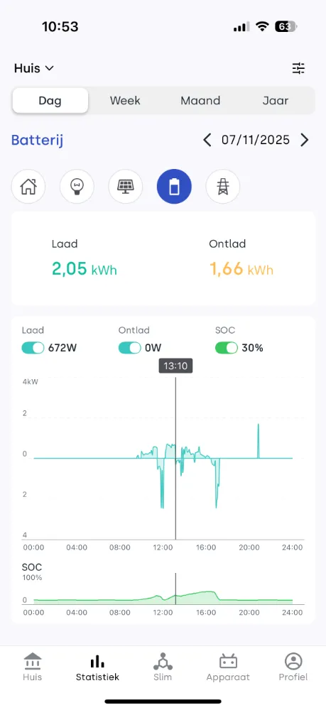 De weergave van de statistieken is nu rustiger en dankzij betere vertalingen een stuk begrijpelijker. In het startscherm zie je in één oogopslag alle dag-gegevens: hoeveel energie in de batterij is geladen, hoeveel stroom je uit het net hebt gebruikt en hoeveel de batterij heeft geleverd. De real-time animatie laat direct zien of de batterij op dat moment aan het laden of ontladen is en of je direct aangesloten zonnepanelen stroom opwekken.