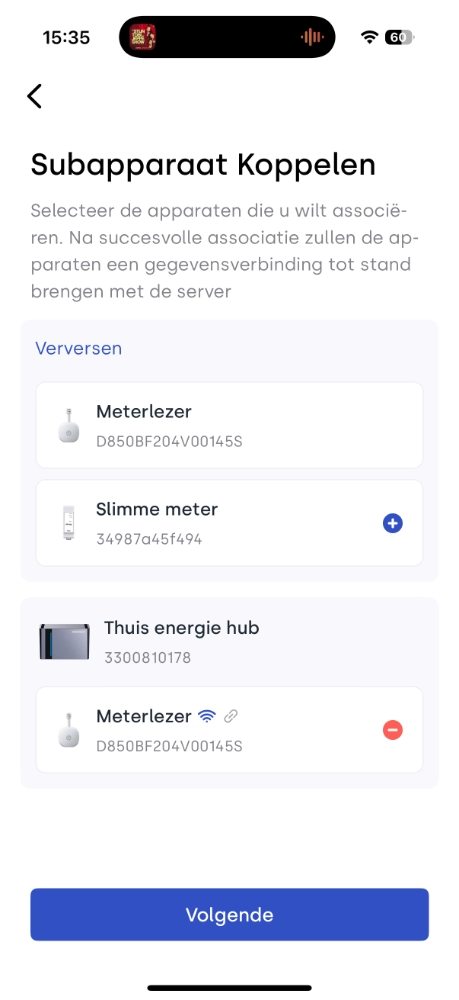 Via Instellingen > Subapparaat koppelen kan je de Solarman P1 Meter koppelen met de SolidFlex 2000.